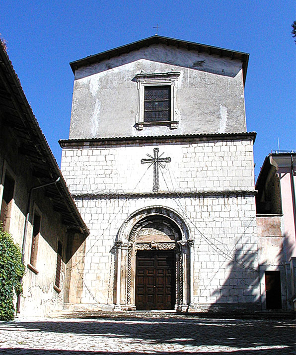 Il risultato di questi radicali rimaneggiamenti fu che la rinascimentale facciata in pietra concia, con i suoi due diseguali ordini, venne a costituire la parte inferiore della nuova fronte, salvo rimuovere il rosone, come appare a prima vista, sostituito da un finestrone al centro della parte rialzata (13). Riguardo alla facciata, oggi coperta dall’impalcatura richiesta dai lavori di ristrutturazione post terremoto, il portale riproduce in maniera quasi perfetta quello della chiesa madre assergese, del quale deve ritenersi contemporaneo, vale a dire realizzato nella prima metà del XV secolo. Le sole differenze degne di nota vanno ravvisate nel fogliame dei capitelli e nella diversa composizione del fregio decorativo dell’architrave, meno elaborati quelli aquilani (14).