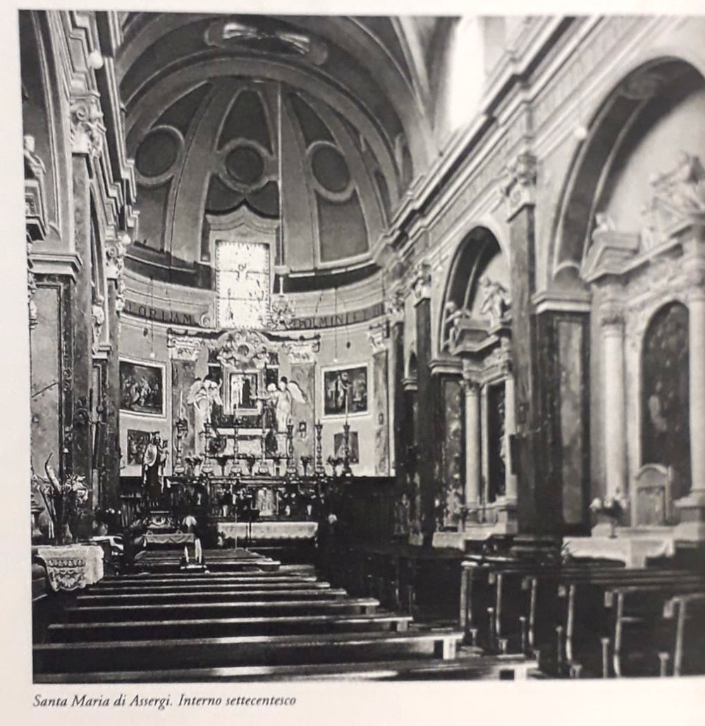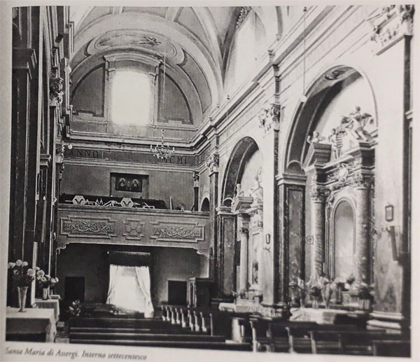 Questo sistema parietale plastico riproduce, secondo l’Antonini, quello strutturale del Cipriani presente nella cattedrale di San Massimo (21). Siamo dunque in presenza di uno degli esempi più rappresentativi di quelle riprogettazioni settecentesche aquilane di chiesa a navata unica (22). L’interno settecentesco, con i suoi tipici richiami barocchi, a me che scrivo, le rare volte che da ragazzo varcavo la soglia di questa chiesa con il nome di ‘Assergi’ nella mente, richiamava l’immagine della chiesa madre del paese, Santa Maria Assunta, prima dei restauri, e ciò mi faceva sentire a casa mia.