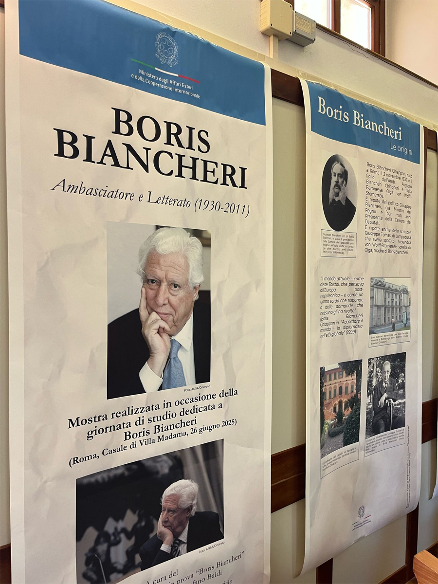 Accanto al libro, una mostra di tredici pannelli ha ricostruito con rigore cronologico le tappe della sua vita, intrecciando fotografie d’archivio e testi per raccontare non solo una carriera, ma una visione del mestiere diplomatico. Particolarmente intenso, infine, il video realizzato per l’occasione, centrato su un intervento registrato dello stesso Biancheri. Ascoltare la sua voce ha permesso ai presenti di cogliere in modo diretto il suo stile riflessivo, la sua leadership mai ostentata e la sua visione pragmatica delle relazioni internazionali.