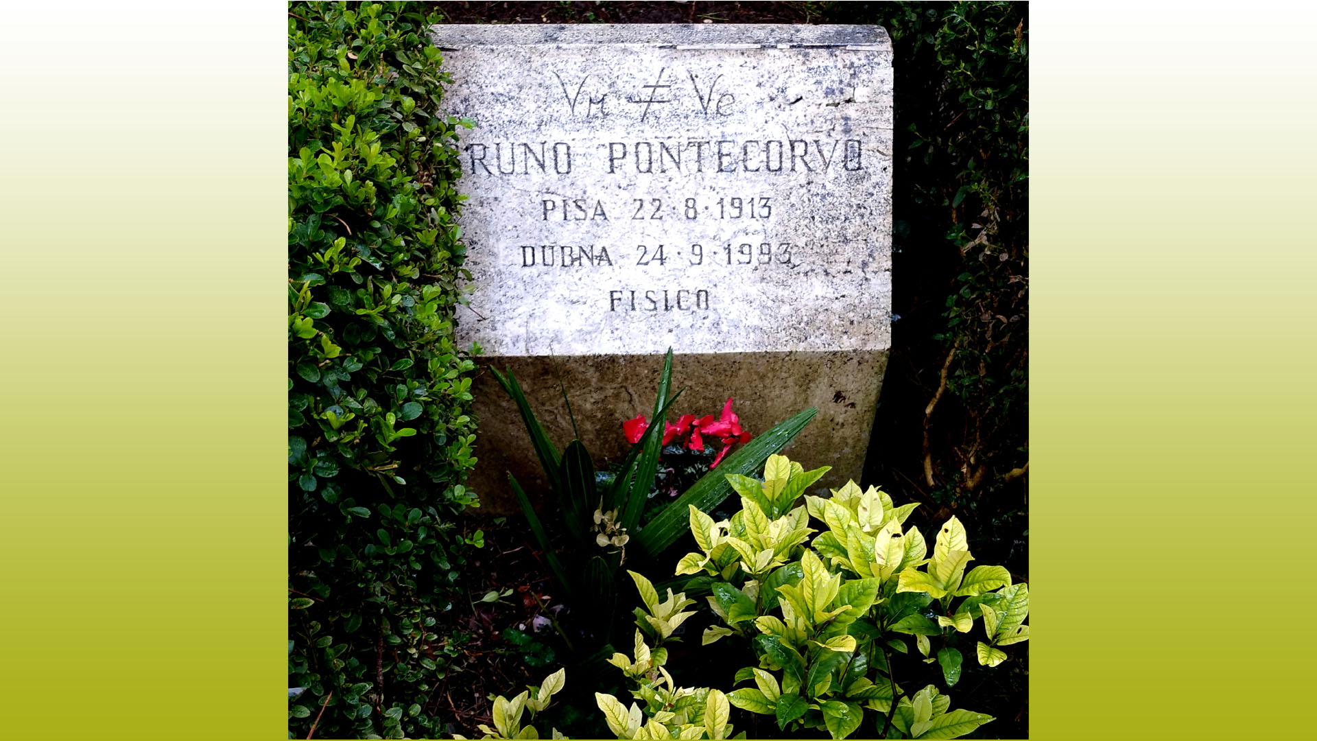 Quale sigillo ad una ricerca scientifica complessa lunga una vita (e di stimolo a ben quattro Premi Nobel che, in pratica, confermarono le sue teorie), per l’anticipatrice possibilità d’un evento fisico (la realizzazione d’un ciclotrone d’alta intensità capace d’accelerare protoni fino a 800 MeV), per la sua proposta, sempre per primo, d’un esperimento per dimostrarlo (il progetto di costruire un acceleratore di protoni a 800 MeV d’alta intensità non andò a buon fine e non riuscì a realizzare il test a Dubna) e, poi, per aver percepito (ancora in esclusiva) che il neutrino Ve è una particella diversa dal neutrino Vμ (suggerendo una verifica dimostrativa). Sulla lapide sepolcrale nel Cimitero acattolico fu incisa in alto l´epigrafe Vμ+Ve , seguita da “BRUNO PONTECORVO / Pisa 22 – 8 – 1913 / Dubna 24 – 9 – 1993 / FISICO”.